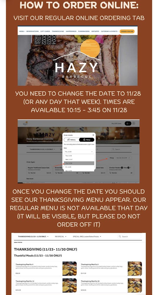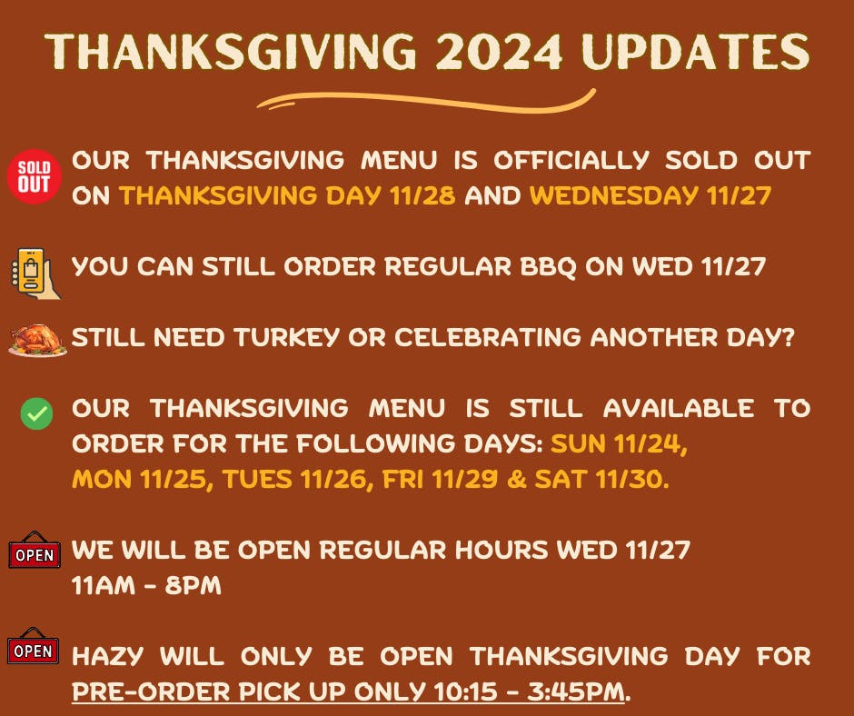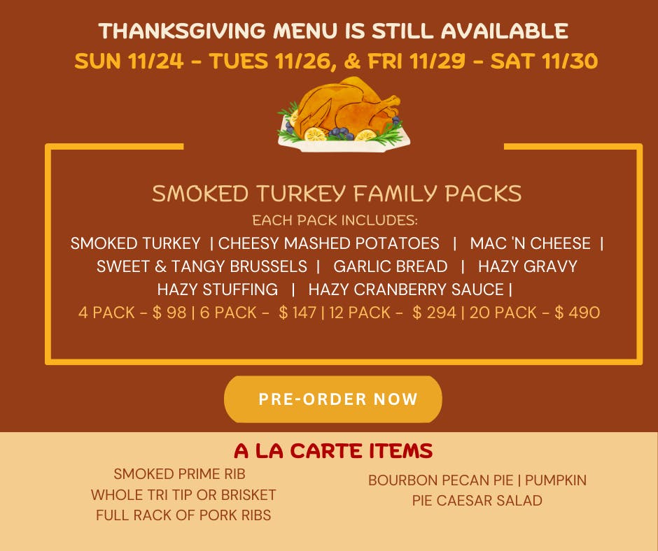 A: YES! AVAILABLE THE ENTIRE MONTH OF NOVEMBER, EMAIL US AT CATERING@HAZYBBQ.COM TO LEARN MORE ABOUT BOOKING YOUR THANKSGIVING THEMED EVENT.